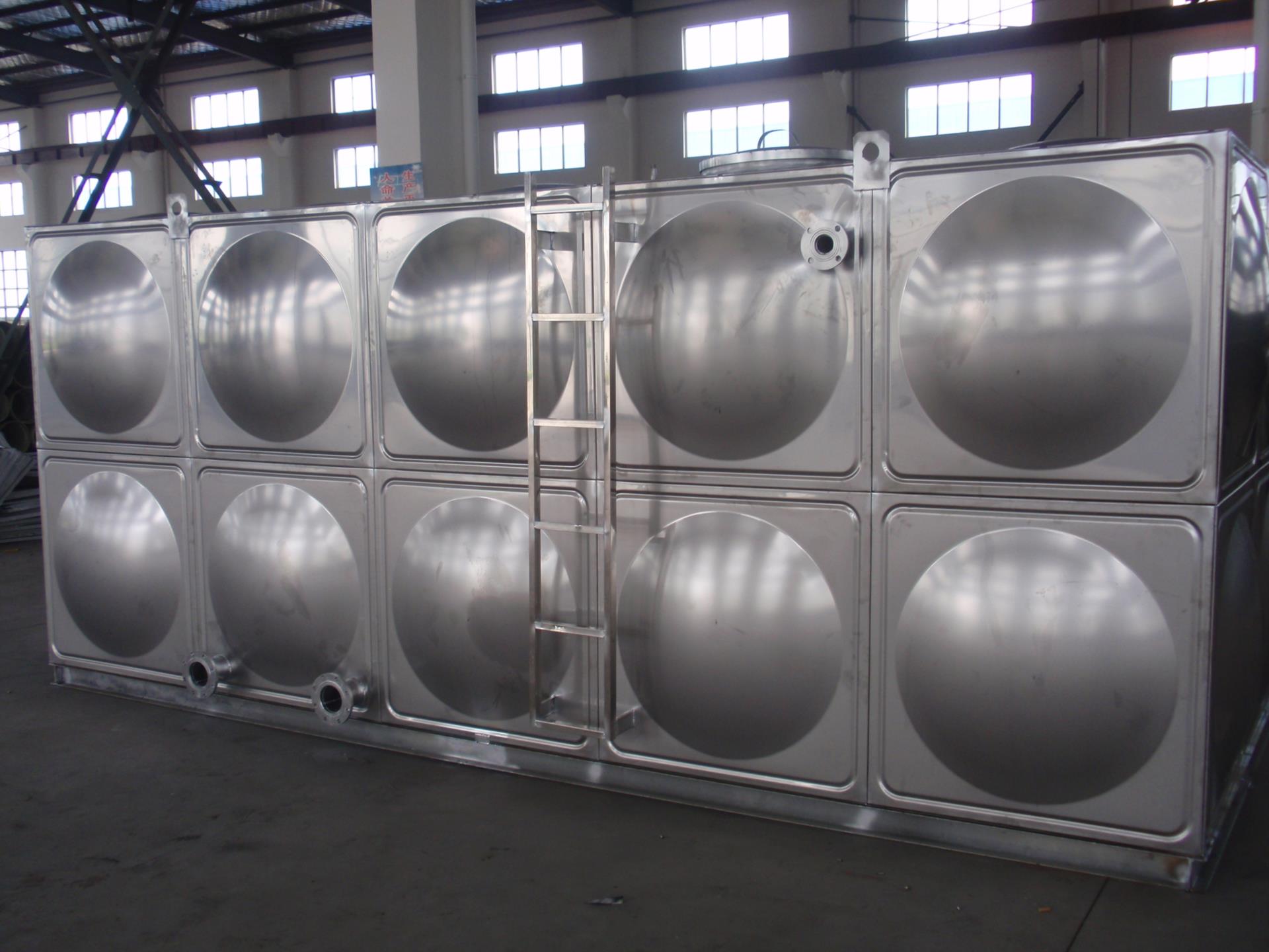 不锈钢水箱多为方形组合式水箱。采用SUS304、SUS316L 、SUS444等不锈钢板,冲压成型。 一般冲压成三种尺寸,分别是1x1米、1x0.5米和0.5x0.5米三种,周边用钨极氩弧焊接,具有强度高、重量轻、成本低、环保卫生等特点。制造标准为国家建筑标准12s101设计图集。